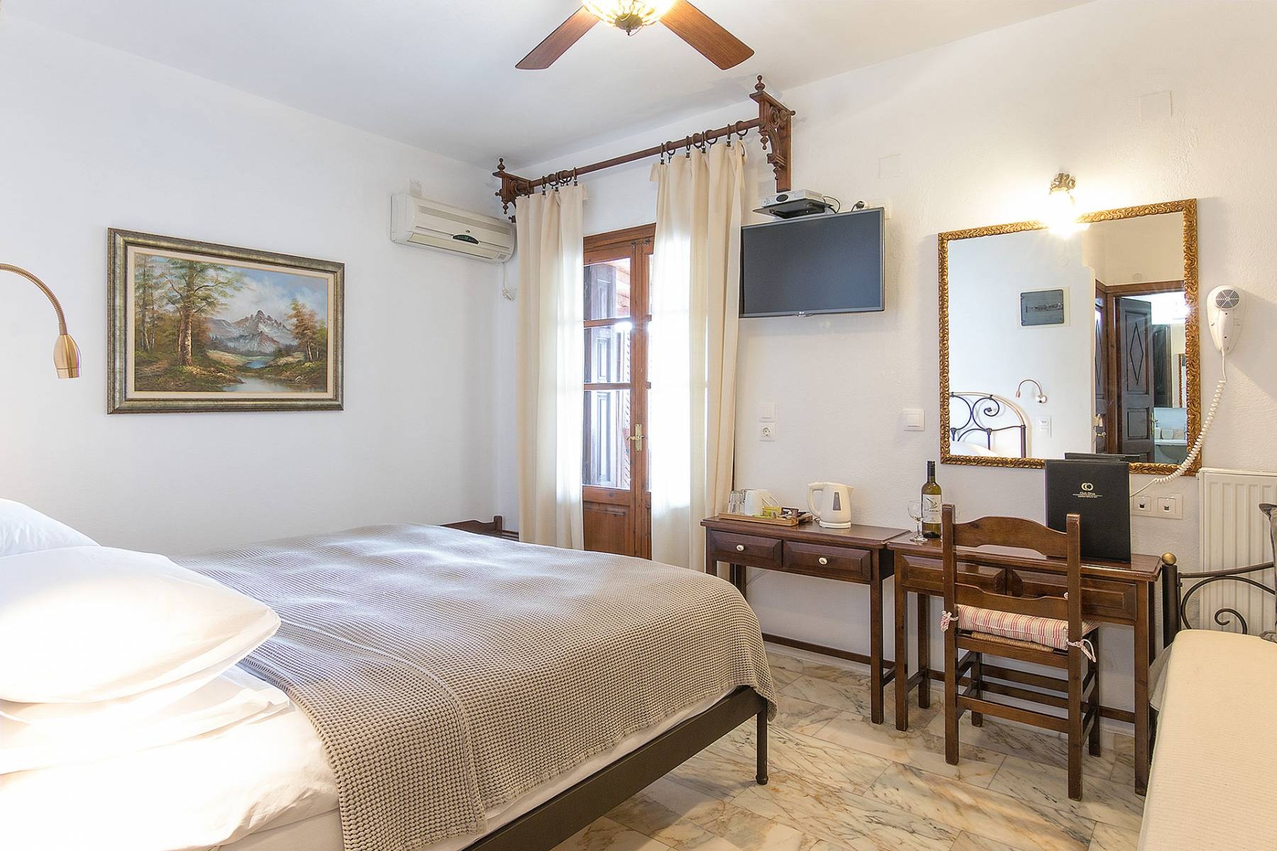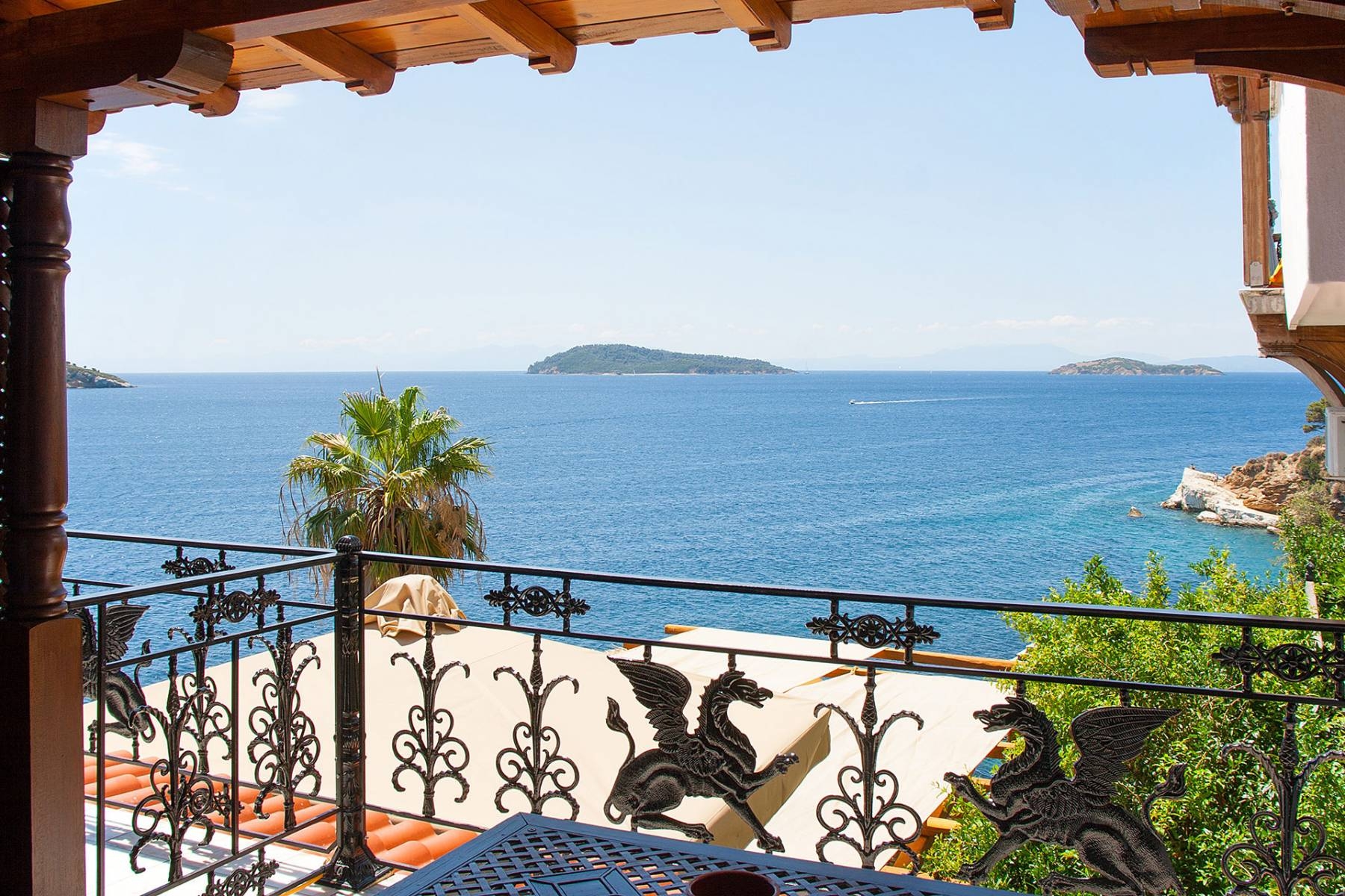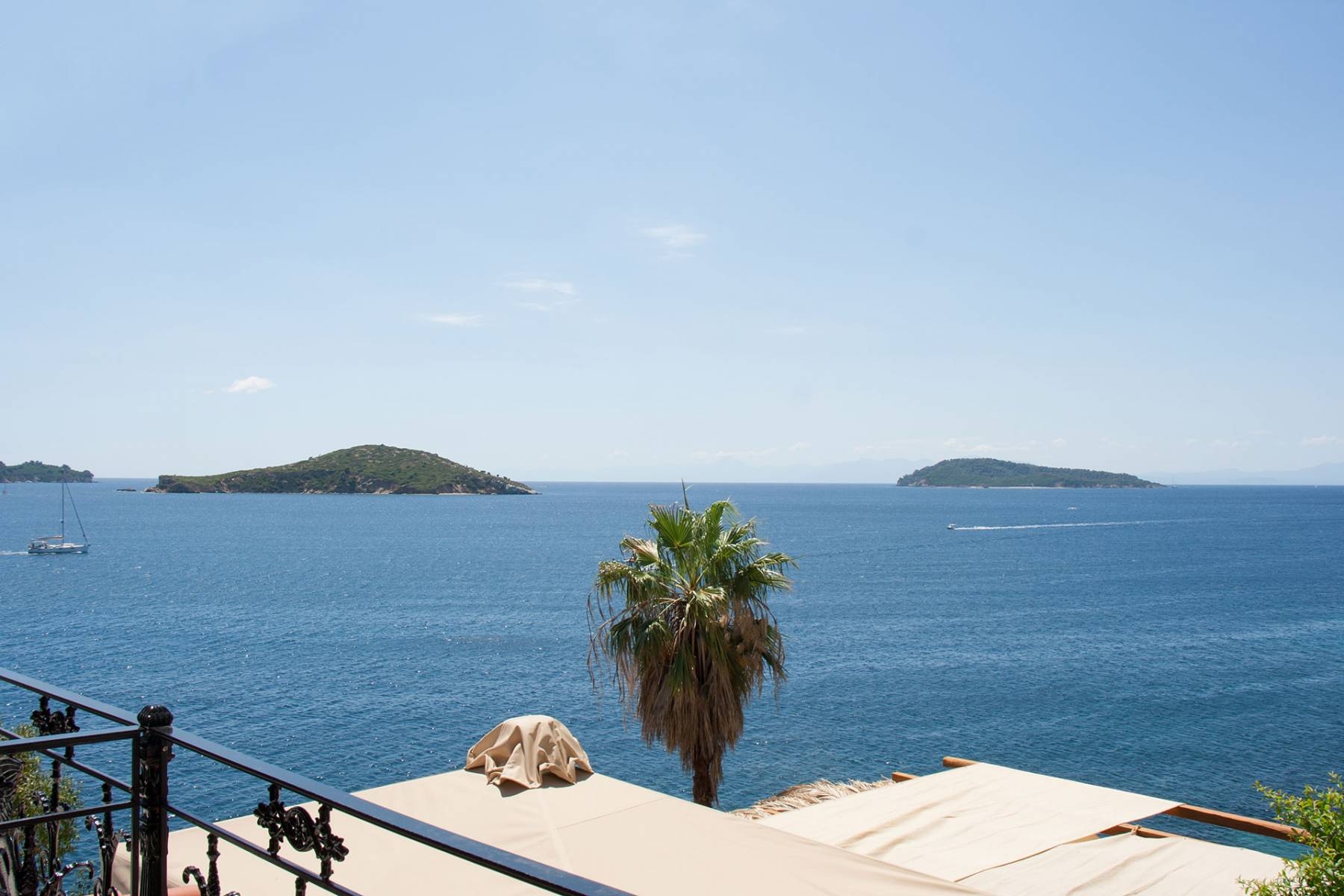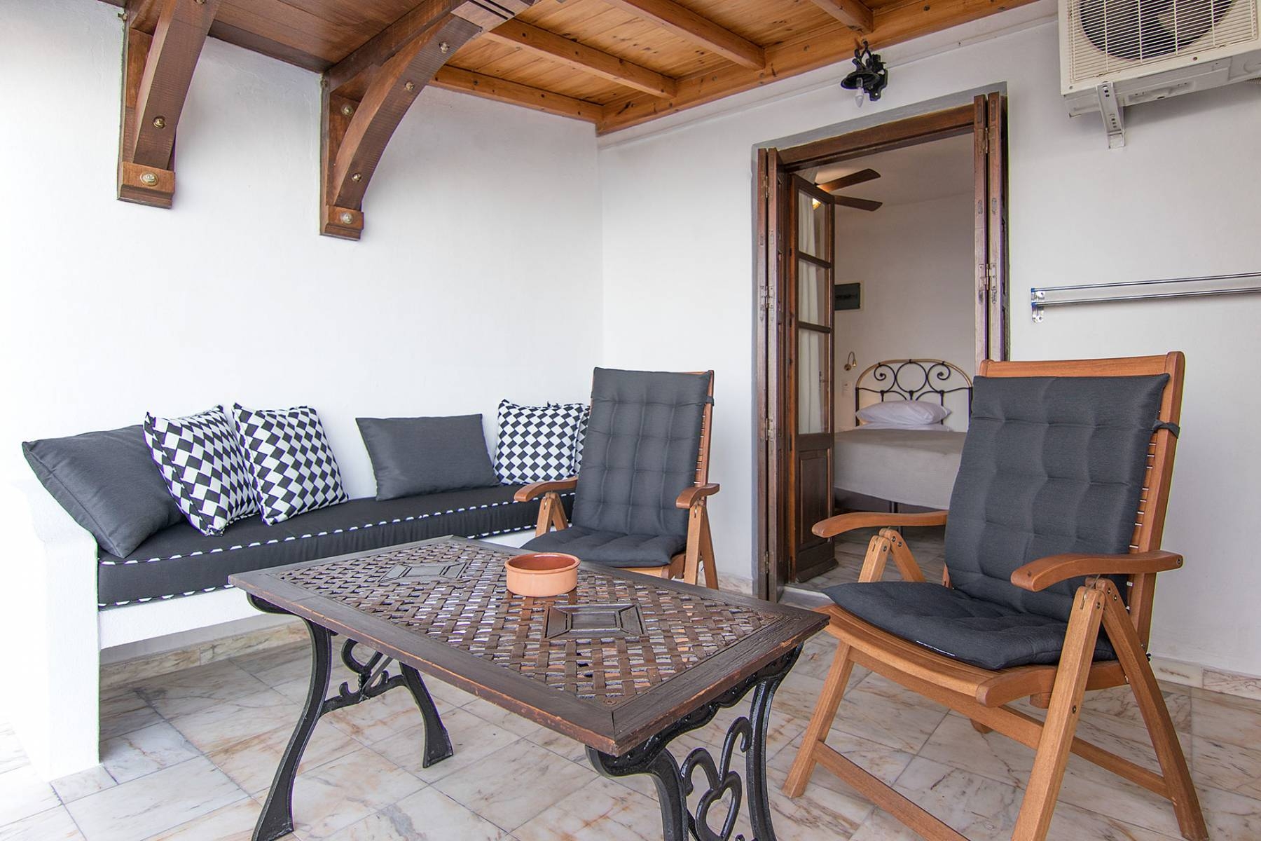 The exclusive triple room is located on the second floor with furnished balcony and views over the Aegean Sea.