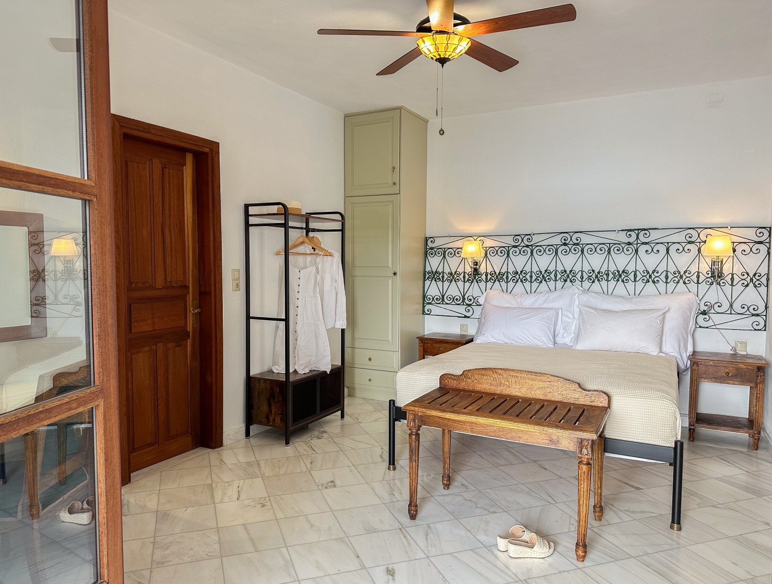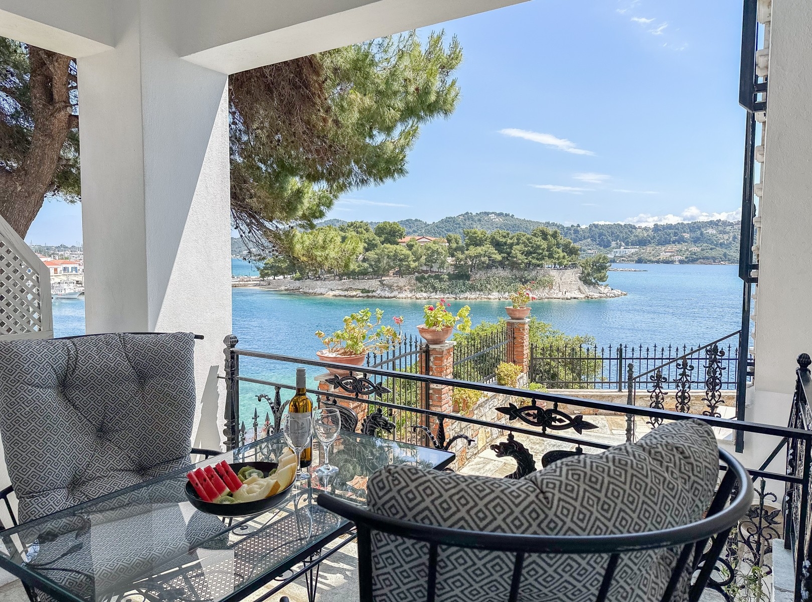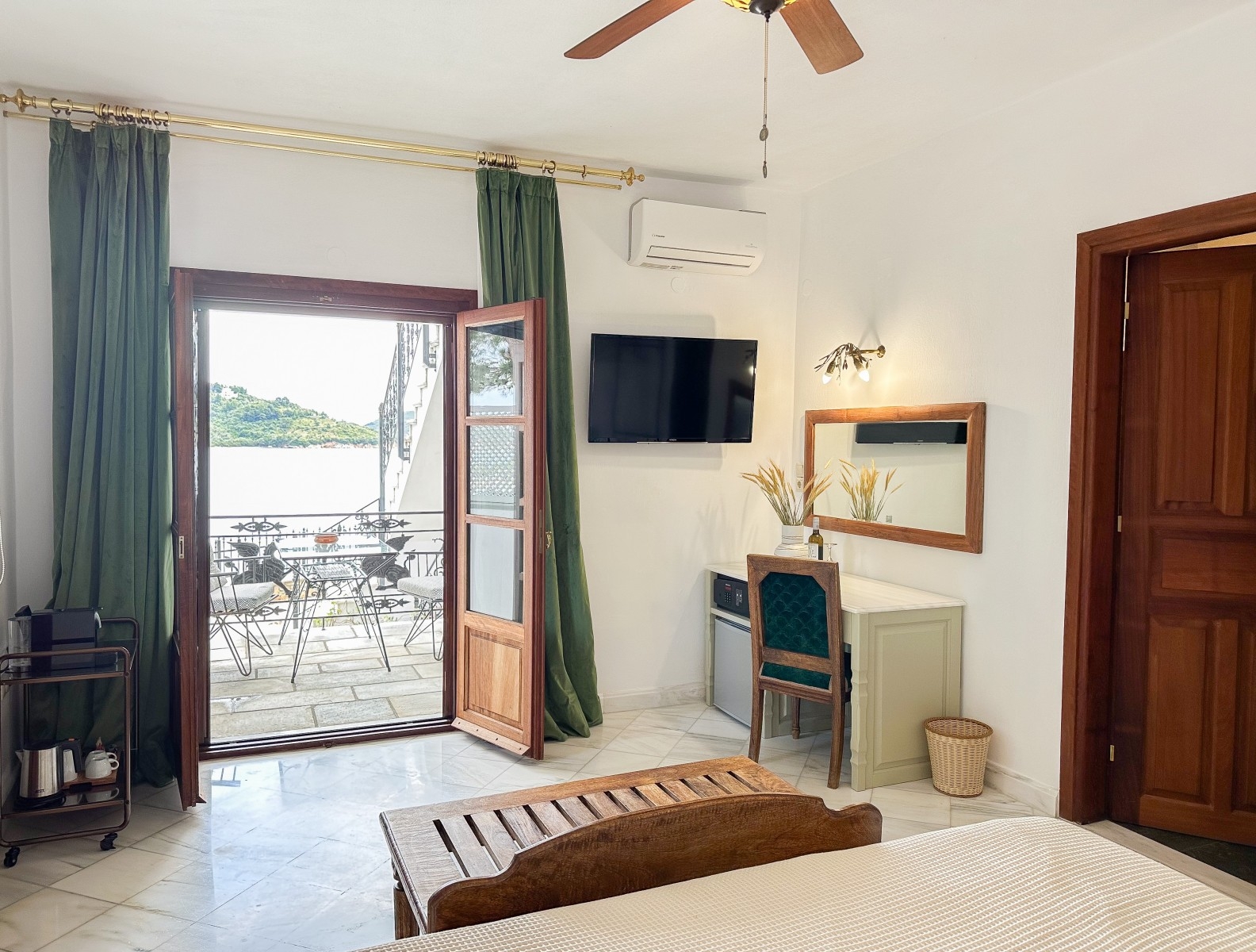 The Deluxe double room is located on the first floor with a furnished balcony and sea view of the old port and Bourtzi. From the garden there is private access to the seafront for swimming and complimentary sunbeds for your use.