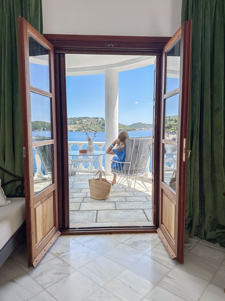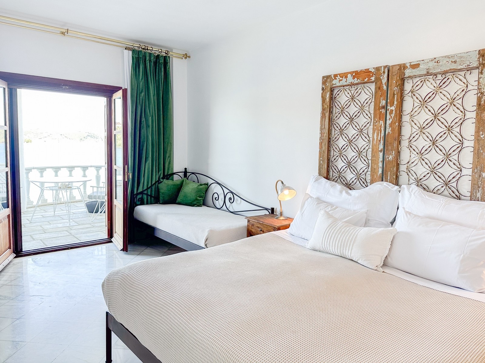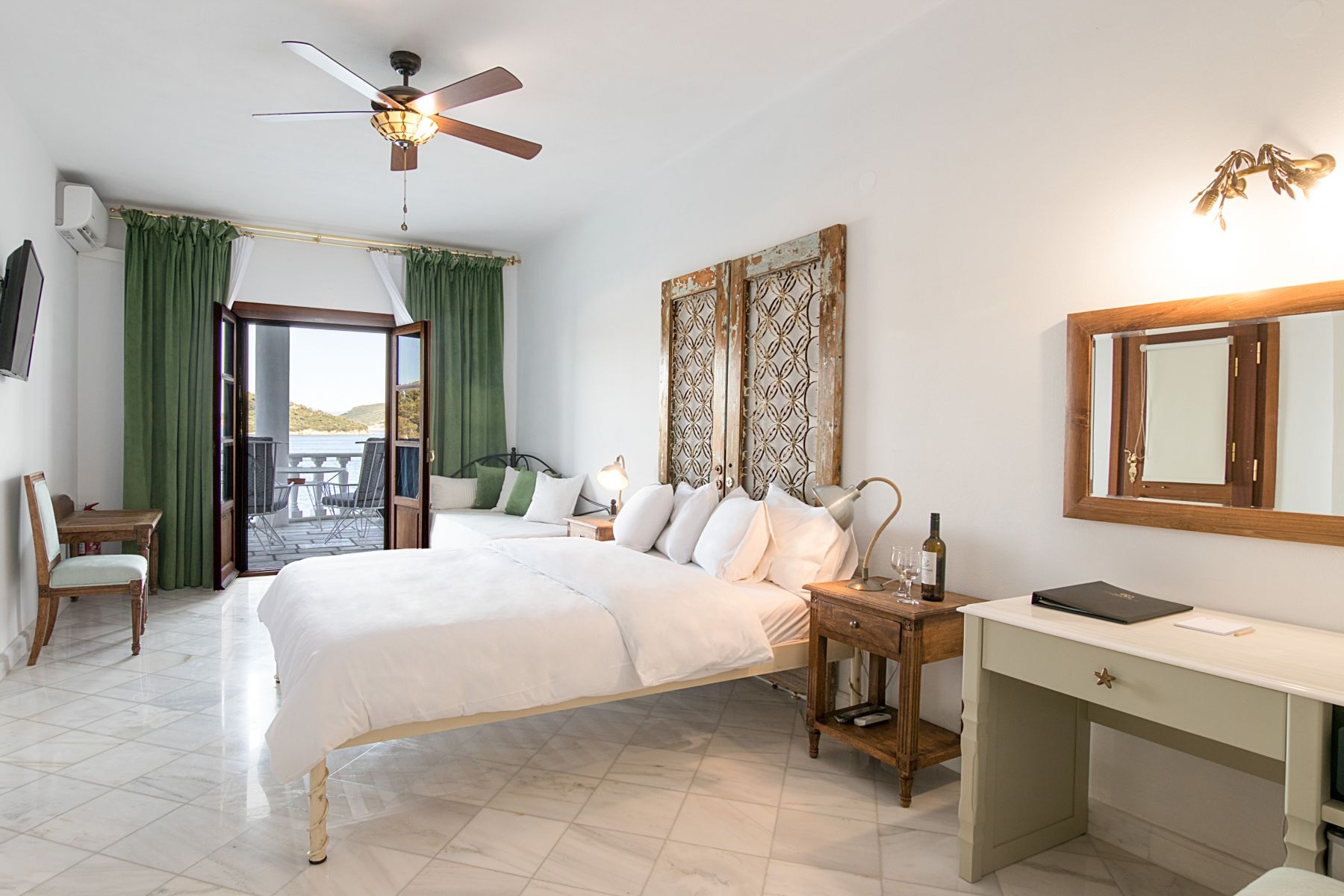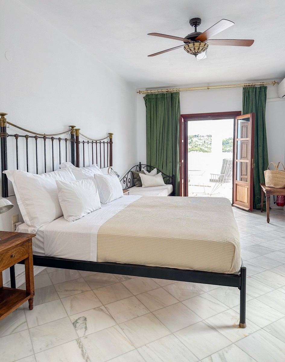 The Superior Suite is located on the first floor with a furnished balcony and stunning sea view of the old port and Bourtzi from the round balcony. There is access to the garden for sunbathing and to the seafront for swimming.This room comprises of one King size bed, one sofa regular bed & can accommodate a baby cot.